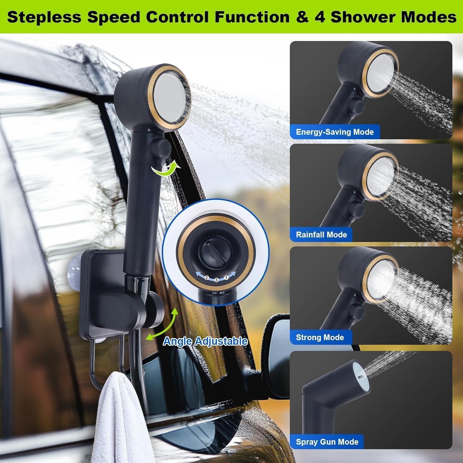 • [Powerful & Customizable Water Pressure] Enjoy a more comfortable shower with our lightweight showerhead. Experience ultimate flexibility with new 5-speed adjustable shower pump pressure and 4 water flow modes. Choose from gentle, medium, or powerful water flow, and fine-tune the pressure to your preference. Perfect for camping, hiking, or emergency use, this portable shower ensures a customized and refreshing shower every time