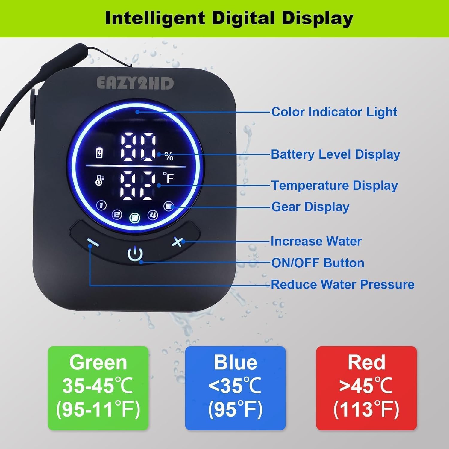 • [Quick-Connect Hose & LED Display] The quick-connect hose makes setup and storage a breeze, while the built-in temperature display keeps you informed of water conditions. ,allowing you to monitor the battery level and check the current water temperature (range: 50-140°F / 10-60°C) with ease