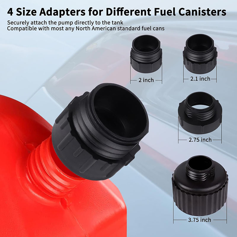 4 Size Adapters & Wide Pump Compatibility: We provide 4 adapters for different fuel canisters that allow you to securely attach the pump directly to the tank. This ensures a leak-free connection and prevents mishaps during transfers. The adapters come in sizes of 2 inch/2.1 inch/2.75 inch/3.75 inch - please check your cans' compatibility before purchasing