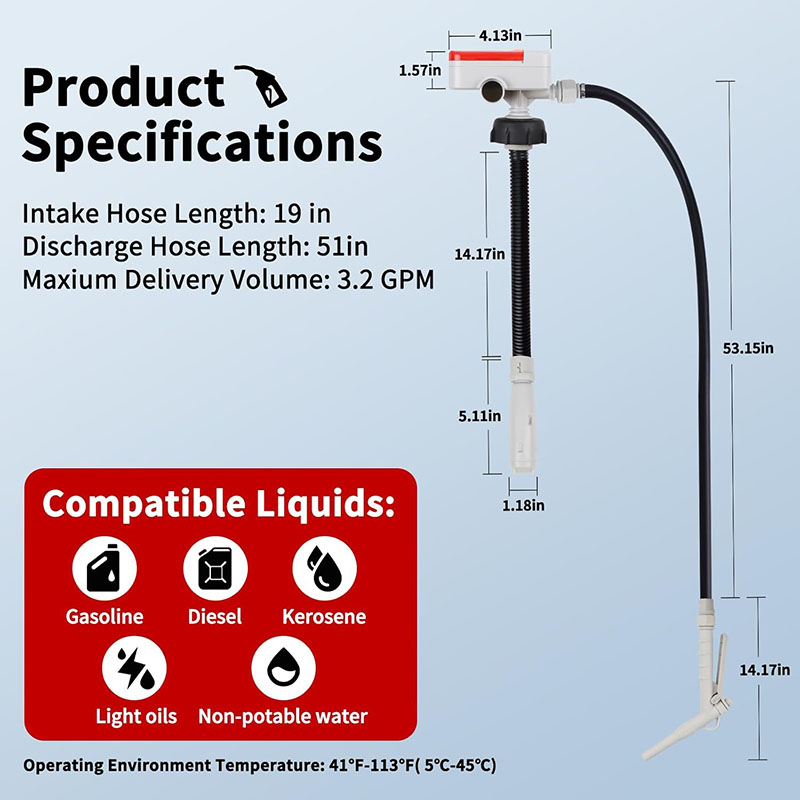 3.2GPM Maximum Flow & 51-inch Rubber Hose: With a maximum flow of 3.2 GPM, this pump allows you to quickly transfer fluids to other containers without heavy lifting or strenuous effort. It can empty a full 5-gallon gas can within just 2 minutes! The hose is made of flexible rubber which is more sturdy and less prone to crack in the sun, easy to use and does not leak