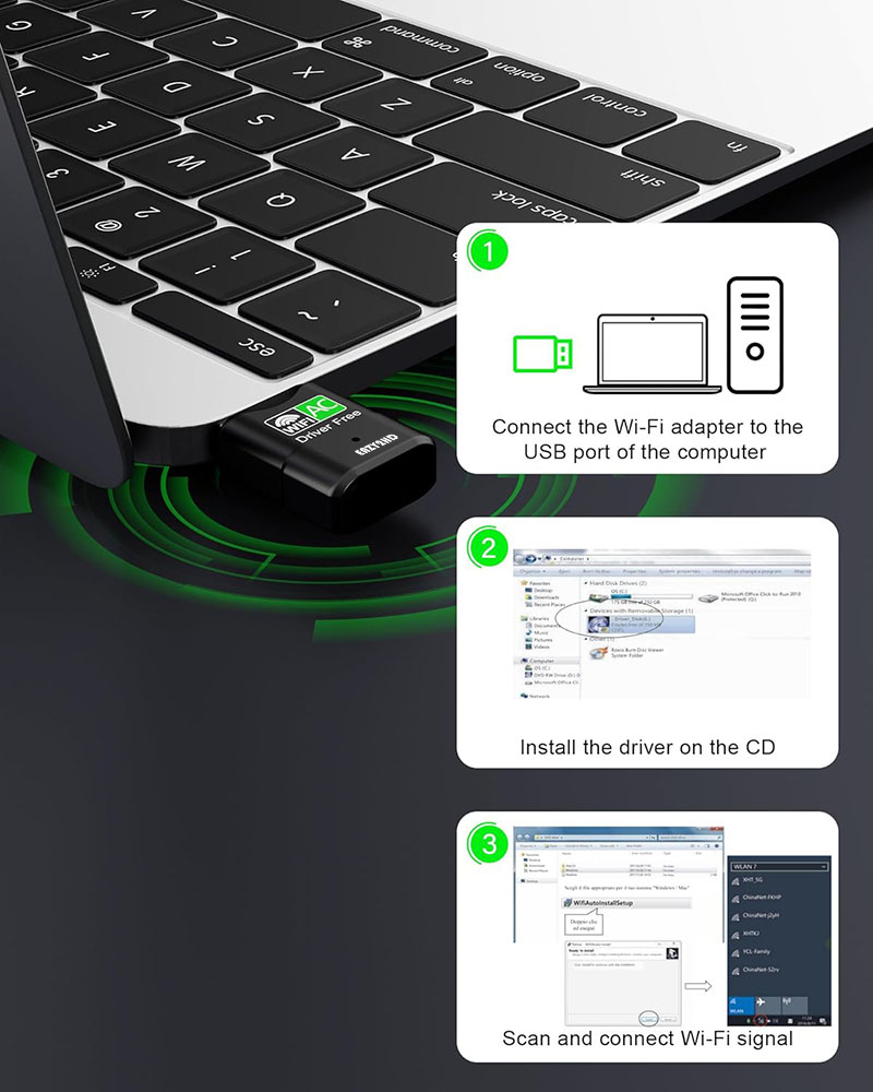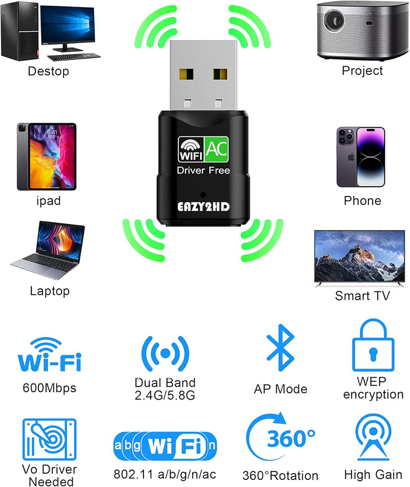 【Built-in Drivers for Hassle-Free Setup】The USB Wi-Fi dongle comes with pre-installed drivers, eliminating the need for CDs or manual downloads. Simply plug this PC Wi-Fi adapter into your desktop or laptop, and it’s ready to use—no technical expertise required!